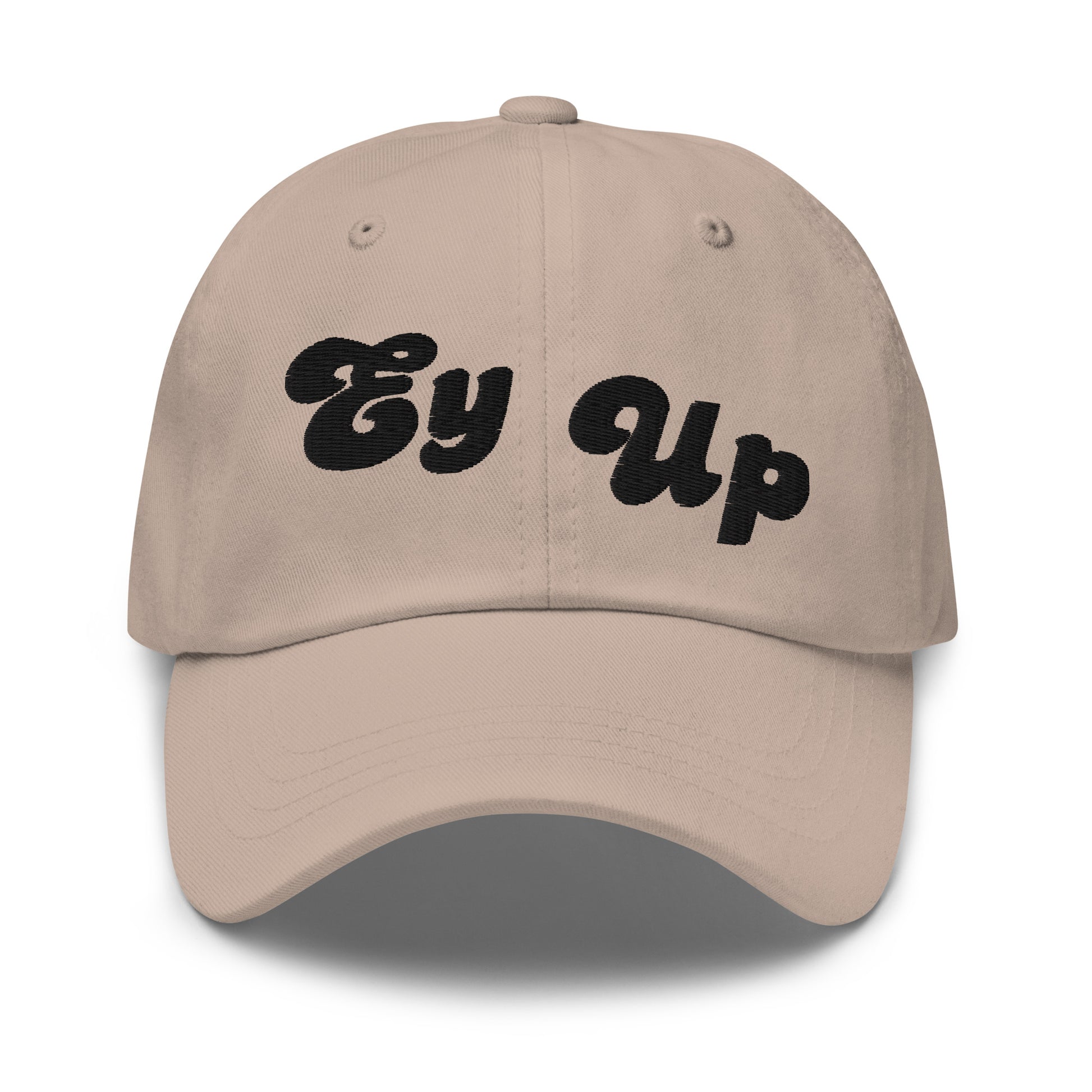 Cotton twill cap with a low profile, adjustable strap and curved visor. Ey Up is embroidered on the front in black thread. One size fits most.